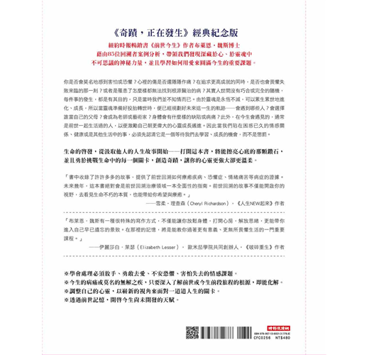 「書中收錄了各式各樣的案例,提供了前世回溯如何療癒疾病、恐懼症、情緒痛苦等病症的證據。未來幾年,這本書絕對會是前世回溯治療領域一本全面性的指南。它不只能開啟你的視野,去看見生命不朽的本質,也能帶給你希望與療癒。...