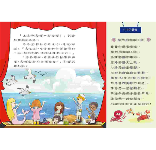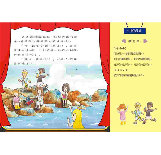 住在深海底的小美人魚,好奇的游到岸邊,看到了海面上的新世界。小美人魚結識了一群可愛的小朋友,透過小朋友的介紹,對這個繽紛美妙的世界有了初步的認識,彼此還互相交換生活的經驗。