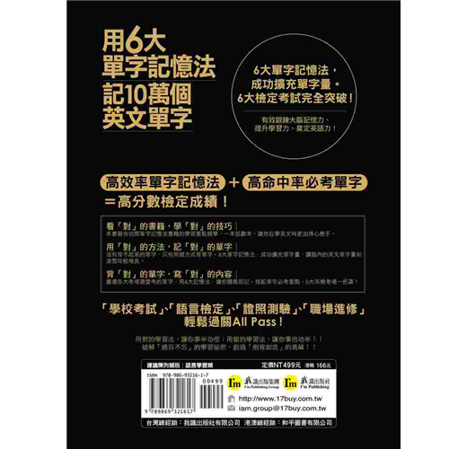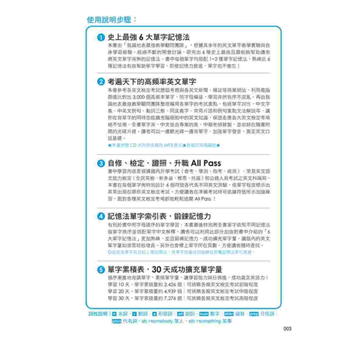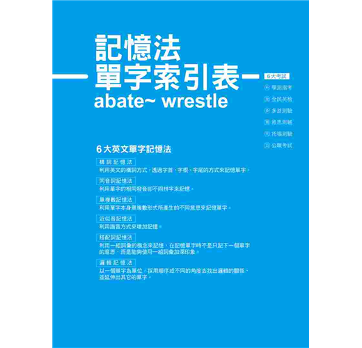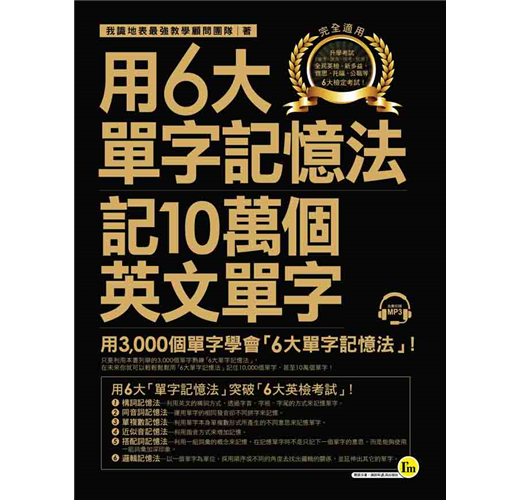 《用6大單字記憶法記10萬個英文單字》集結6種高效率單字記憶法和收錄3,000個高命中率必考單字,讓你考取高分數英檢成績。本書完全適用「升學考試(會考、學測、指考、統測)」、「全民英檢」、「新多益」、「雅思」、「托福」、「公職」等6大英檢考試!