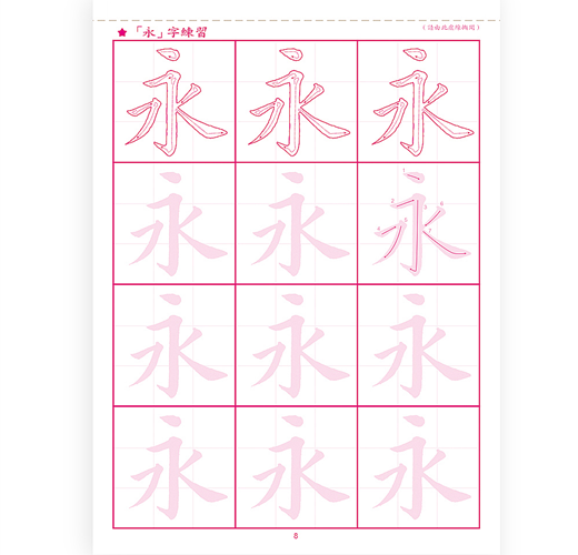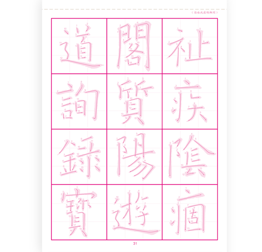不同於多數描紅簿使用框線字,本書採用描紅版式,避免孩子以塗鴉方式填寫。