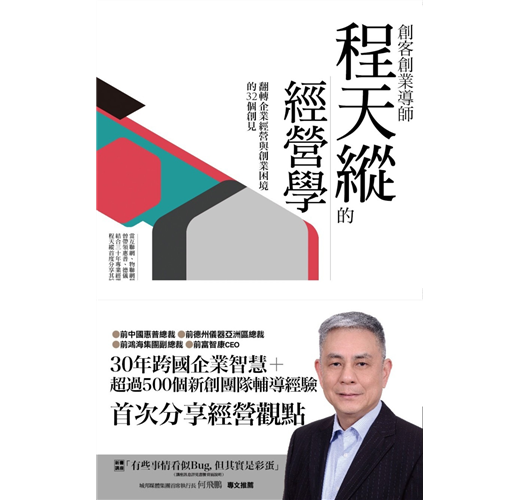 打開《縱觀經營》,看創客創業導師程天縱點破新時代傳產、科技業、新創者共同面臨的困境,首度分享其綜觀全局的經營觀點!