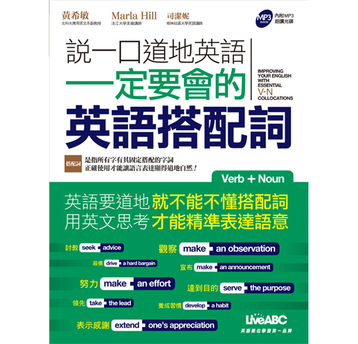 我們經年累月學習文法與單字,可能已經習慣用公式來拼湊句子,然而工整的文法與艱深的單字所堆砌出的英語文,常讓外行人覺得厲害、內行人覺得奇怪,而這中間欠一味 就是「道地」。用法越道地英語就會越自然,與英語系國家的人溝通也就越容易。