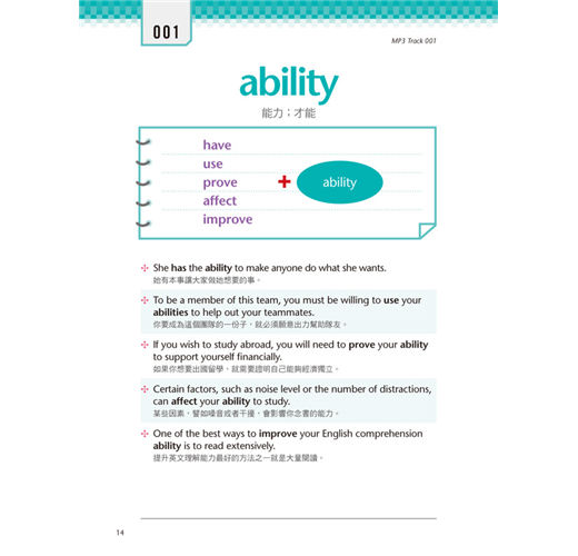 英語是很生動的語言,只要將書中的搭配詞轉換成情境畫面來記憶,就更容易正確地使用出來。利用情境畫面來練習的方式,相較於從中文翻譯成英文,可避免受到中文的影響,也能藉著描述畫面將英語與情境之間建立直接的連結,這是一套內化的過程,一旦掌握這套內化心法,學習英語將更加有趣並事半功倍,進而能鞏固腦中新的英語系統、擁有完整的英文資料庫。
