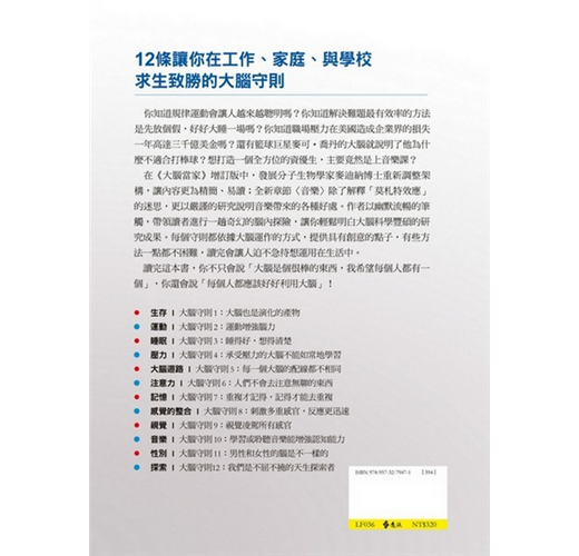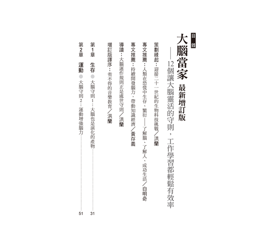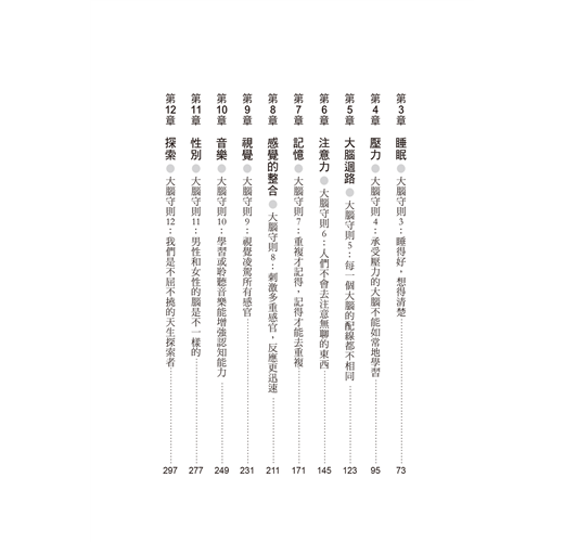 策劃緣起:迎接二十一世紀的生物科技挑戰/洪蘭 專文推薦:人類在恐慌中生存、繁衍——了解腦、了解人、成功生活/白明奇 持續開發腦力,帶動知識經濟/黃存義 增訂版譯序:省不得的音樂教育/洪蘭 導讀:大腦運作規則正是處世守則/洪蘭 第一章〈生存〉●大腦守則1:大腦也是演化的產物 第二章〈運動〉●大腦守則2:運動增強腦力 第三章〈睡眠〉●大腦守則3:睡得好,想得清楚 第四章〈壓力〉●大腦守則4:承受壓力的腦不能如常地學習 第五章〈大腦迴路〉●大腦守則5:每一個大腦的配線都不相同 第六章〈注意力〉●大腦守則6:人們不會去注意無聊的東西 第七章〈記憶〉●大腦守則7:重複才記得,記得才能去重複 第八章〈感覺的整合〉●大腦守則8:刺激多重感官,反應更迅速 第九章〈視覺〉●大腦守則9:視覺凌駕所有感官 第十章〈音樂〉●大腦守則10:學習或聆聽音樂能增強認知能力 第十一章〈性別〉●大腦守則11:男性和女性的腦是不一樣的 第十二章〈探索〉●大腦守則12:我們是不屈不撓的天生探索者