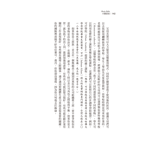 〈增訂版譯序〉省不得的音樂教育/洪蘭 上個世紀資訊爆炸,所累積的知識是過去二千年的總和;這個世紀才過了不到五分之一,所累積的新知已經要超越上個世紀了。在這些日新月異、快速湧出的知識中,大腦科學是其中進步最快的一個領域。腦造影技術的精進使大家終於了解生命的中樞在腦而不在心,人的好壞也是在他的大腦而不在他的心好不好。 因為一般人無法直接觀察大腦的運作(除非在腦造影室),所以對很多人來說,大腦是神秘的。有一本很暢銷的科普作品《神經外科的黑色喜劇》(When the Air Hits Your Brain),是一位神經外科醫生的成長紀錄,描述由於人的大腦不可能接觸到空氣,當它接觸到空氣時就是神經外科動刀的時候,那是差一、二毫米就會造成這個人失去某個功能或半身不遂的。又因大腦跟智商有直接的關係,人們(尤其父母)對如何增進大腦功能使孩子聰明就大感興趣了。家長感興趣的地方就是商人財源的所在,坊間一些似是而非的教養書因此因應而生,提出各種健腦課程,讓父母失財,讓孩子受罪。 本書作者是華盛頓州立大學分子細胞學實驗室訓練出來的神經科學家,一直從事大腦和基因在認知功能上的研究,所以他的書可信度高,在美國賣得非常好,在台灣也有不錯的銷售成績,如果連不愛買書的台灣這本書都能增訂新版,可見它有一定的水準值得父母信賴。最新增訂版除了每一章節都有增加新的知識之外,最特別的是作者還新增了音樂這一章。音樂和美術的課程在大人眼中是可有可無,每次政府財政一緊縮,第一個砍掉的便是學校的音樂美術課程,在偏鄉和山地,更是十個學校有九個沒有音樂老師。這其實非常錯誤,因為音樂的重要性在它能改變大腦,尼采說「沒有音樂的世界是個錯誤」非常正確。有一次我到美國開會,抽空在晚上去聽了一場德弗札克的《新世界交響曲》,後來連續三天,只要一靜下來,腦海就浮現它的旋律,想停都停不了,好的音樂真是會一直在你腦海中轉,滋養你的心靈。 為什麼《新世界交響曲》的旋律對我有這麼大的迴響力呢?原來我念初中時,每天回家後放下書包第一件事便是打開電唱機(那時還是黑膠唱片),聽它的第三樂章來紓解考了一天試的緊張和疲勞有關。《新世界交響曲》可以說伴我度過了煩躁鬱悶的青春期,我也從那幾年中領會到音樂對一個人心智健康的重要性。 作者在音樂這一章中提出很多父母所關心議題的實驗證據,例如音樂能增強語言能力,因為它可以訓練聽覺皮質的敏感度,使學生易於辨識語音;音樂有旋律,這些旋律的重複增加了工作記憶的訓練,而工作記憶是所有認知能力的根本(訊息進入大腦後,需先經過工作記憶的處理,才能進入長期記憶,因工作記憶包括視覺空間描繪本〔visuospatial sketchpad〕和語音迴路〔phonological loop〕這兩個跟IQ、學業成績都有關係的部分);音樂的訓練還能增進孩子的社交技巧,因為它使孩子容易察覺別人情緒的變化,增加他們的同理心。 音樂能使大腦產生多巴胺(dopamine),這是種正向的神經傳導物質,對情緒和記憶有幫助,也使大腦產生催產素(oxytocin)這種跟親子聯結(bonding)、親密的社會行為有關的重要神經傳導物質。實驗甚至發現同台演奏的音樂家們,大腦會分泌催產素來增加他們演奏的默契,使他們合作無間。 音樂扣人心弦,使人感動落淚。有一次,我聽到阿里山鄒族的孩子在唱〈安魂曲〉(Miyome),當下讓我流淚不止,音樂感動人心的力量是非經歷其境的人不能了解的,音樂教育真的不能省。 一個人可能沒有美術天份,但可以懂得欣賞一幅好畫的意境;一個人也可能沒有音樂天份,但仍然能欣賞好的音樂,而這個欣賞的能力是我們需要在孩子小的時候帶給他們,使他們在人生逆境時有紓解情緒的工具。音樂不但撫慰我們的心靈,也能治療心靈的創傷。 工欲善其事,必先利其器,作者很用心的把孩子大腦發展的歷程所顯現出來行為告訴父母,希望讀過這本書後,父母教養孩子會更輕鬆,我們的孩子會更快樂。