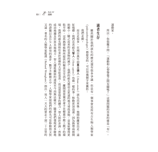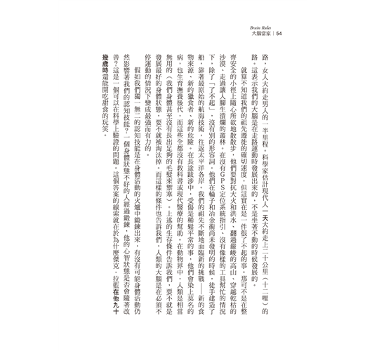 第二章〈運動〉#大腦守則2:運動增強腦力 你會像吉姆還是像法蘭克一樣變老? 科學家從老人身上看到運動對大腦的好處。幾年前我在電視上看到一部紀錄片,描述美國養老院內的情況。一群八十多歲的老人坐在輪椅上,一字排開在昏暗的燈光下,他們就僅是坐在那兒消磨時光,像是等待死亡的接引。其中有一個老人叫吉姆,他的眼神空洞、寂寞,沒有朋友,面對人生晚年這樣的處境,他大可以老淚縱橫,但是他所有的時間都花在凝視著空間中的某一點。我轉台,轉到看起來還很年輕的華勒斯(Mike Wallace,譯註:美國很有名的電視主播和資深媒體人)在訪問知名的建築師法蘭克.羅伊.萊特(Frank Lloyd Wright),他在那時已是八十多歲了。這是我見過最有意思的對話。 「當我走進紐約市的聖派屈克大教堂(St. Patrick's Cathedral),我被一種崇敬的氣氛所包圍。」華勒斯邊說邊彈著煙蒂。 老人看著華勒斯說:「你確定這不是一種自卑情結(inferiority complex)?」 「你是說因為教堂很大而我很渺小?」 「是的。」 「我想不是這個原因。」 「我希望不是。」 「你在走進聖派屈克教堂之時什麼都沒有感覺到嗎?」 「遺憾,」萊特立刻回答。「因為它沒有真正表現出個體獨立和自主的精神,而我認為這種精神應該在我們致力於文明所造的建築物中必須傳遞出來。」 我被萊特巧妙的回答所震撼,在短短的幾分鐘內,你可以察覺到他心思的敏捷清楚,他堅定的立場,他願意跳出窠臼的思考。接下來的訪談跟前面一樣精彩,就如同他後來的生活一樣。他在一九五七年完成古根漢博物館(Guggenheim Museum)的設計,這是他生前最後一件作品,那年他九十歲。有一件事同時也讓我震撼,當我在琢磨著萊特的回答時,我想起養老院的吉姆,他跟萊特是同樣的年齡,事實上,養老院裡大部分的老人都是。我突然看到兩種類型的老人:吉姆和萊特成長在差不多的年代,但是一個心智幾乎完全萎縮,就像是被老化給折磨和凋零,而另一個卻像電燈泡一樣發出熾熱的光來。 在他們老化的過程中有什麼差別造成如此的不同呢?這個問題曾經困擾著研究團隊多年。科學家為了解釋這些差異找出很多新發現,我把這些發現歸類到六個問題的答案中。 ■有沒有單一因素可以預測你會如何老化? 當開始研究老化時,這是一個很難回答的問題。研究者發現很多變項,從先天到後天,都與一個人能否優雅地進入老年有關。這是為什麼當一個研究團隊發現某個強有力的環境因素時,其他科學家報以好奇和謹慎。科學家發現優雅的老化最強的預測因子是這個人的生活型態,他是否是個整天坐在辦公室不動的人。 簡單地說,假如你是個沙發馬鈴薯,老的時候比較可能像吉姆,前提是你能活到八十歲的話。假如你的生活型態很活躍,你到老的時候比較像萊特,你很有可能活到九十多歲。主要的原因表面上看起來是運動增加心臟血管的健康,所以比較不容易得心臟病和中風,但是研究者不了解為什麼成功進入老年期的人,他們的心智也比較警覺,這導致下面這個問題: ■運動讓人比較機靈嗎? 幾乎所有的心智測驗他們都做了,不管怎麼測量,答案都是肯定的:一個終身運動者,他的認知功能比那些坐著不動的人高出很多。這些測量包括長期記憶、推理、注意力以及問題解決。他們在流動智慧(fluid intelligence)的作業上表現也比較高,這些作業測試快速推理、抽象思考,以及用先前學的知識來解決新的問題。基本上,運動增進教室和職場所需的許多重要能力。 運動在非年長者的作用為何呢?相關研究並不多,但有一個研究是檢驗一萬名英國的公務員,年齡在三十五歲到五十五歲之間,依他們運動的習慣將他們分成低、中、高三組,結果發現低運動組的認知表現也比較不好,需要即時反應的流動智慧是最受靜坐不動生活型態的傷害。 不過運動並不能增進所有的認知功能,短期記憶及某些反應時間作業就跟身體的活動無關。雖然每一個人都會因為運動而改善認知功能,但是改進的程度卻是因人而異,有很大的個別差異。有運動的人通常也比較聰明這是一回事,但證明運動能直接導致這個好處又是另一回事。這些數據雖然很強,但只是相關數據,並非因果關係。實驗者必須做比較侵入性的實驗來回答下一個問題: ■你能把吉姆變成法蘭克嗎? 這些實驗不禁讓人想到電視上的變身改造節目。實驗者先對一群不愛動的沙發馬鈴薯老人測量腦力,然後要他們運動一段時間,再測一次。他們發現那些參加有氧運動課程的馬鈴薯,所有的心智能力都有進步,甚至只要做四個月的有氧運動,就能觀察到明顯改善。小學生也是如此。另一個研究發現小學生一週只要慢跑二次到三次,每次三十分鐘,十二週以後,他們的認知表現就比慢跑前進步了很多。當運動停止後,他們的成績又退回到慢跑之前的程度,科學家找到直接的關係了。在某個限度之內,運動的確可以把吉姆變成法蘭克,或至少能把吉姆變得比較機伶。 當運動對認知的效果越來越顯著時,研究者問了沙發馬鈴薯這一族人最關心的問題。 ■要做什麼類型的運動?做到什麼程度才行? 研究老人族群多年之後,研究者對於應該運動多少的問題,答案是不必太多。只要你每週散步幾次,你的大腦就會得到益處。即使是沙發馬鈴薯,會起來走動的也比不動的好。我們的身體似乎大聲抗議要回到非洲大草原那種不停活動的源頭,任何朝向那個演化