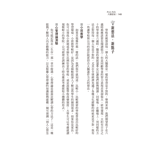 前言: 請在大腦中心算8,388,628×2,你能在幾秒之內得出答案嗎?有一個年輕的男孩做得到,而且還能持續乘上二十四次,每一次都算對;還有一個男孩可以告訴你現在是幾點幾分,甚至把他從睡夢中叫起來,他也能正確地說出時間。有一個女孩可以正確地告訴你六公尺外某個物體的尺寸;另一個女孩六歲時就畫出許多栩栩如生、充滿活力的畫作,有人認為她所畫的「飛馳的馬」更勝達文西的畫作呢。然而上述這些孩子他們的智商都不到七十。大腦實在是一個神奇的東西!你的大腦也許稱不上怪,但實在是一個奇特的東西。它可以算是地球上最精密的訊息轉換系統,讓你能夠知道書上這些小黑線的意思是什麼。為了要達成這個奇蹟,你的大腦送出電流,在幾百公里長的神經纖維上快速奔跑,你在不到一眨眼之間的時間內完成這項作業,而這些神經元小到幾千個神經元可以一起擠到本句的句點中。你剛剛就是在進行這項作業,但是你不自覺。同樣令人驚訝的是我們大部分人都不知道我們的大腦是怎麼運作的。 大腦守則 我寫這本書的目的是讓你知道關於大腦運作的十二條規則。我把它稱為「大腦守則」,我會先告訴你每一條規則的科學證據,並介紹背後的研究者,然後告訴你如何應用到日常生活中,尤其是應用在學校和職場的表現上。大腦很複雜,每一個主題我只能選一些你馬上可以聯結到生活上的資訊,雖然不是很完整,但是我希望都是你可以理解的。你會碰到下面的例子: ●我們是無法在書桌前面坐八個小時的。從演化的觀點來看,我們是在一天走或跑二十公里的同時發展我們的大腦。大腦仍然渴求那種經驗,這是為什麼運動會增加我們的腦力(大腦守則2),尤其對我們這種整天坐辦公室或教室的人來說,更是如此。有運動的人長期記憶比每天躺在沙發上不動的人強,他們的推理能力、注意力 及問題解決能力也比較好。 ●假如你參加過研討會,看過主講人一張又一張地播放投影片時,你一定會發現人無法對無聊的東西集中注意力(大腦守則6)。通常你有幾秒鐘的時間去捉住人們的注意力,然後大約可維持他人的注意十分鐘左右;在九分五十九秒時,你一定要再做些什麼事來重新捉住人們的注意力,使大家能再注意十分鐘,這件事必須能引起 情緒共鳴,並且跟主題相關的才行。同時,大腦也需要暫時休息一下,這是為什麼在本書中,我用故事來闡明我的論點。 ●你曾在下午三點鐘左右覺得疲倦嗎?這是因為你的大腦很想小憩一會兒,假如你暫停工作去休息一下,稍後的效率會更好。有一個研究發現,二十六分鐘的小憩,能增加美國太空總署飛行員表現的百分之三十四。你前一晚睡眠是否充足也會影響第二天的心智表現—睡得好,就想得清楚(大腦守則3)。 ●在本書中,你會讀到有一個人只看一眼就能過目不忘,永遠記得書上寫的東西。大部分人是忘的比記的多,這是為什麼我們要重複背誦才記得(大腦守則7)。當你了解大腦的記憶規則後,你就了解為什麼我很反對家庭作業的概念。 ●我們會探討為什麼兩歲的孩子怎麼講都講不聽,他們的叛逆行為,其實是大腦想要探索的強大驅力造成的外顯現象。嬰兒可能對外面的世界所知不多,但他們非常了解要怎麼樣獲得外面的知識,我們是天生的探索者(大腦守則 12 ),這個渴望從來不曾離開過我們,即使生活在人造的環境,探索的需求仍然活在我們的血液中。 龜毛係數 我是個好人,但我也是個壞脾氣的龜毛科學家。能夠出現在本書的實驗研究,都需通過我某些客戶口中的麥氏龜毛係數(Medina Grump Factor, MGF)認證,這表示我所採用的研 究必須發表在同儕審定的期刊上,而且它的效果必須成功地被其他實驗室驗證。許多我所採用的研究已經被人重複過幾十次,結果是很穩定的。(為了讀者閱讀的方便,很多延伸的參 考資料沒有列在書中,但是你可以瀏覽本書的網站: www.brainrules.net/references) 大腦守則並非正式處方箋 關於大腦,我們尚有許多未解之謎。我是一名專長在精神疾病領域的發展分子生物學家,在我的專業生涯中,有很長一段時間是私人顧問,處理過無數的研究計畫。在我多年職涯裡,我親眼見到基因(DNA指令)與行為(一個人真正的行動)之間有著多大的差距。你很難肯定地說某基因會導致某種行為,或改變A行為來得到B結果。有時候,我會看到一些文章或書籍,宣稱根據「最新大腦發現」,以聳動的言論教導我們如何學習或做生意,例如:鼓勵讓學生聽古典音樂以促進數學能力的「莫札特效應」;或是主張擅長分析者是「左腦人」,而有創意者是「右腦人」,並依此規則管理人才。剛開始我很驚慌,擔心自己是不是漏讀了什麼重要論文?我會說許多大腦科學的方言,但是我卻不知道有這種保證成功的學習和經商方式。事實上,假如我們真的了解大腦如何端起一杯水來喝,這會是一個重大發現。(譯註:作者很含蓄地說出坊間那些賣偽大腦科學的廣告是無稽的。像他這種會說很多大腦方言〔即從分子生物學到細胞系統到行為層次都精通〕的人也不知道這個「最新發現」時,這個發現是沒有科學依據的。)所以我並不需要驚慌。大腦研究雖然無法肯定地告訴我們如何成為比較好的老師、家長、企業領導人和學生,但我會在每個章節最末,列舉大腦研究中較可行的方法,提供給你們在日常生活中實踐。但是,這些並非正式處方箋,它們只是假設而已。如果你願意嘗