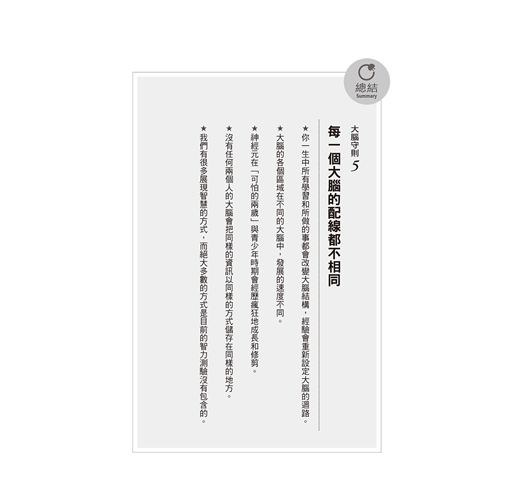 策劃緣起:迎接二十一世紀的生物科技挑戰/洪蘭 專文推薦:人類在恐慌中生存、繁衍——了解腦、了解人、成功生活/白明奇 持續開發腦力,帶動知識經濟/黃存義 增訂版譯序:省不得的音樂教育/洪蘭 導讀:大腦運作規則正是處世守則/洪蘭 第一章〈生存〉●大腦守則1:大腦也是演化的產物 第二章〈運動〉●大腦守則2:運動增強腦力 第三章〈睡眠〉●大腦守則3:睡得好,想得清楚 第四章〈壓力〉●大腦守則4:承受壓力的腦不能如常地學習 第五章〈大腦迴路〉●大腦守則5:每一個大腦的配線都不相同 第六章〈注意力〉●大腦守則6:...