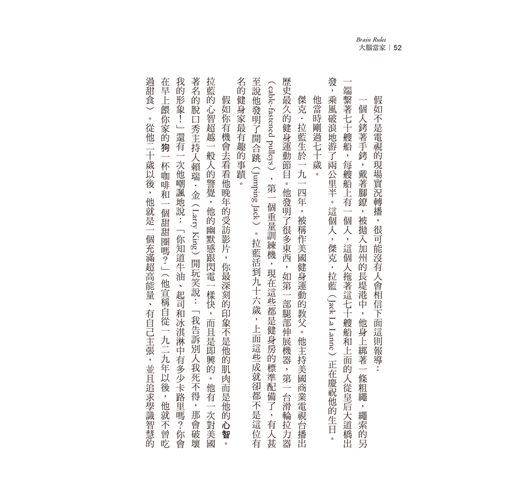 第二章〈運動〉#大腦守則2:運動增強腦力 你會像吉姆還是像法蘭克一樣變老? 科學家從老人身上看到運動對大腦的好處。幾年前我在電視上看到一部紀錄片,描述美國養老院內的情況。一群八十多歲的老人坐在輪椅上,一字排開在昏暗的燈光下,他們就僅是坐在那兒消磨時光,像是等待死亡的接引。其中有一個老人叫吉姆,他的眼神空洞、寂寞,沒有朋友,面對人生晚年這樣的處境,他大可以老淚縱橫,但是他所有的時間都花在凝視著空間中的某一點。我轉台,轉到看起來還很年輕的華勒斯(Mike Wallace,譯註:美國很有名的電視主播和資深媒體人)在...