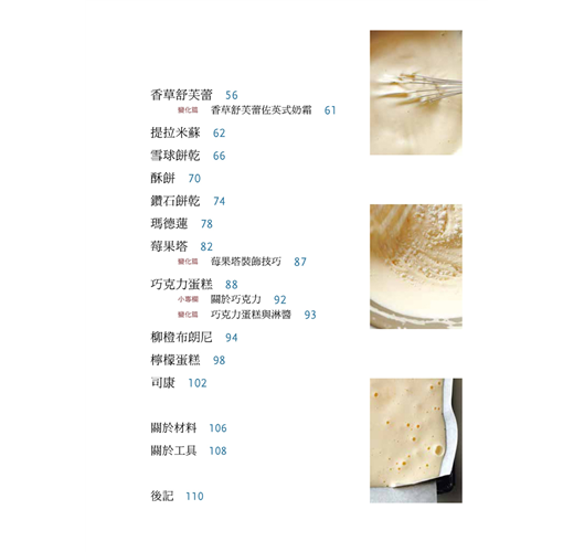 1.反覆研究的縝密配方:從長年鑽研西點烘焙食譜的經驗中,提出各款代表性甜點最佳配方及做法。