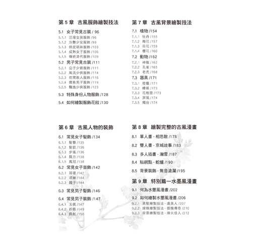 ◎:3~6章詳細講解了古風人物的繪製技法,包括人物的特色、比例,以及各朝代的髮型、服飾和裝飾等表現古風的重要元素。