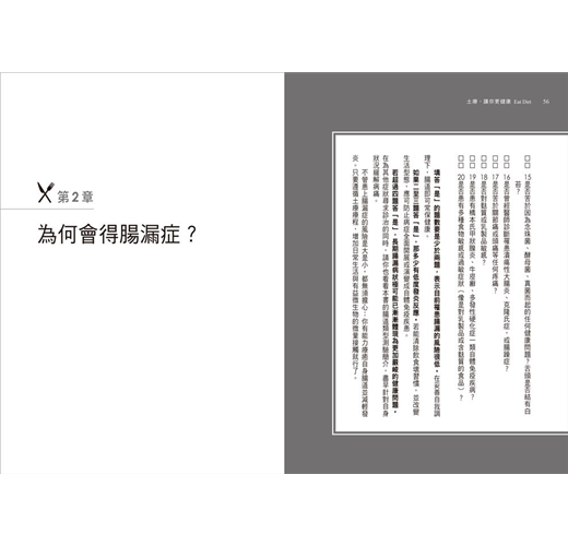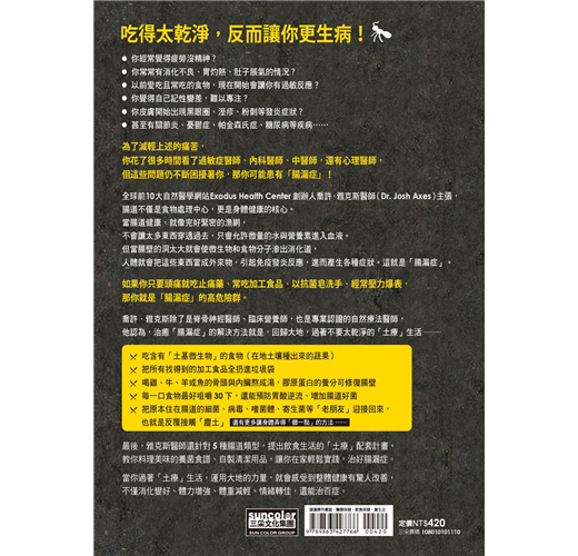 本書作者喬許.雅克斯醫師是功能醫學專家,他行醫過程當中注意到不少自體免疫、過敏及腸胃病患者在發病之前幾乎都有腸漏症的現象,因此提倡土療讓你更健康。其真義和著眼點即在透過飲食、運動、舒壓、補充營養品和益生菌等方式,讓已經失衡的腸內菌相再度回歸正常,從而產生不藥而癒的效果。全書對於近年來因食品科學進展,人為添加物及基改食物,高脂低纖的飲食方式,生活型態,特別是高壓力少活動的狀態,乃至不當的抗生素和藥物使用,對腸內菌相的影響及所帶來的身體災難,經由個案的分享有完整的描述。而且結合中醫的觀察,把腸道病態做仔細的分類,非常具有參考價值。另外,針對伴隨現代化、工業化、便利化而來的不良生活型態及慢性病的增加,也有精闢的見解,值得吾人深省。