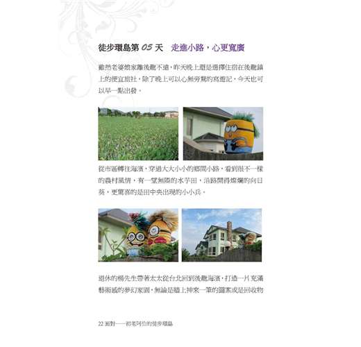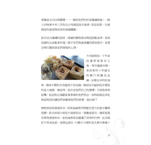 一路上(無論是現實世界還是網路上虛擬世界)他遇到很多貴人、送水送食物的好人,感受到台灣濃濃的人情味。他也一路用文字、用相機記錄下沿途遭遇的人事物、當地物產風土,以及各媽祖廟的異同特色。隨著張訓賓的徒步環島拜訪媽祖廟的進程,我們彷彿也跟著體驗了一遭台灣人情、大地之美,更感受了台灣媽祖信仰的慈悲與溫暖。