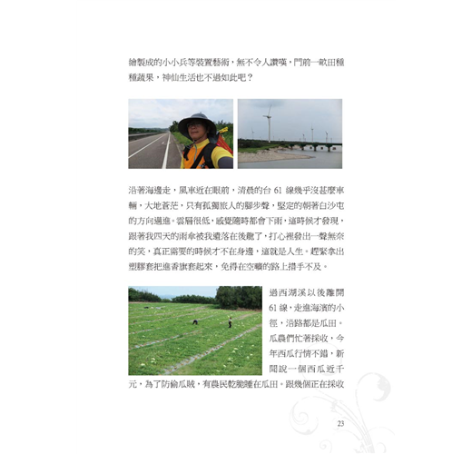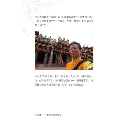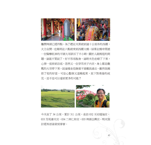作者張訓賓花了38天,環島走訪了108間媽祖廟。30多天的旅程剛好碰到台灣百年難得一見的連續高溫,好多天都在37度的艷陽下行走。不只肉體的磨練,精神上他也承受了嚴苛的考驗,每次精疲力竭的時候總有路過的車輛主動邀他搭便車,但他均一一加以婉拒,盡可能地靠他自己的意志與雙腳走完全程。