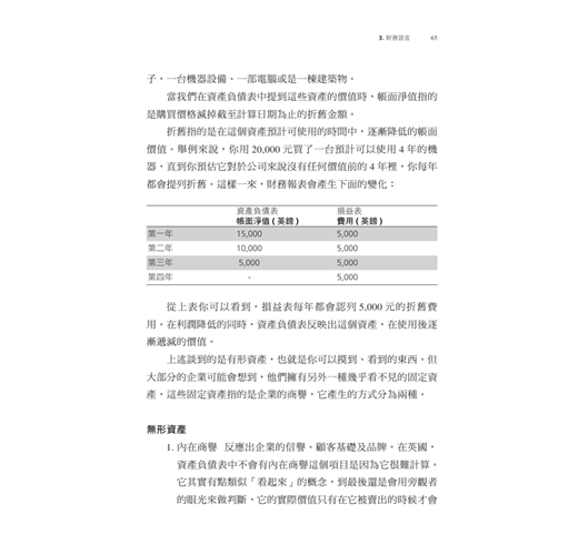 當我們在資產負債表中提到這些資產的價值時,帳面淨值指的是購買價格減掉截至計算日期為止的折舊金額。折舊指的是在這個資產預計可使用的時間中,逐漸降低的帳面價值。舉例來說,你用20,000 元買了一台預計可以使用4 年的機器,直到你預估它對於公司來說沒有任何價值前的4 年裡,你每年都會提列折舊。在利潤降低的同時,資產負債表反映出這個資產,在使用後逐漸遞減的價值。