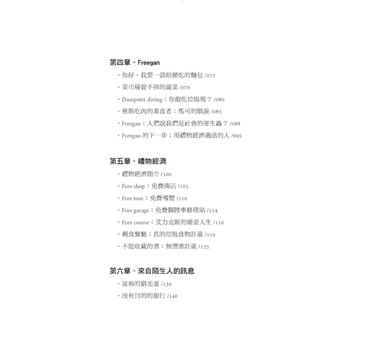 最後,當我們打開超市後方的垃圾桶,發現了那些我們之前不想吃、不忍吃的東 西竟然全都堆在裡頭時,我們將牠們挖出來,帶回去料理,然後含著淚吃掉,成為我們所謂的「Freegan」。