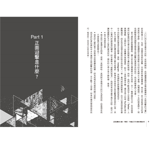 本書作者、溝通專家派崔特提出立竿見影的辦法,指出比謾罵更能解決問題、有禮貌又有力量的「正面迎擊溝通技巧」,幫助你從認識自己的溝通習慣、看清難題狀況、辨別什麼該做什麼不該做,一步步培養自己回應潛在衝突的能力。