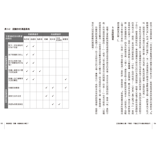 他們講完後,都免不了問我:「我該怎麼辦?」有些故事確實令人傷心,我為他們感到遺憾,我也十分同情他們。我相信每個人都有受不了某些人的行為,或是感到挫敗、敢怒不敢言的時候。我總是帶著同理心傾聽,但同時內心出現另一個聲音,讓我很想搖醒對方,問他:「你為什麼不正面迎擊?」經過一段時間後,我發現:大家不反擊困擾自己的人,是因為不知道該怎麼說、該怎麼做!同時,從大家的敘述中,我注意到他們表現出的負面溝通模式。當人們找不到適當的方法表達不舒服時,就乾脆閉上嘴巴,事後才轉向像我這樣會給予同情的人吐苦水。有些人就是為了找到宣洩情緒的出口,才來參加我的講習會。
