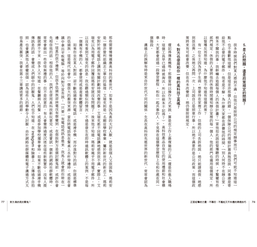 當今網路社群媒體崛起,讓大家在相互溝通與分享生活時,多了一種便捷的方式;然而這個便利的管道同時也帶來彼此誤解或干擾的新煩惱。例如,我們不斷看到有人在推特(Twitter)上展開筆戰,互刪好友;在餐廳共進晚餐時,對方一直低頭滑手機;還有員工利用YouTube 發出辭職通知。因此我在這個全新修訂版中特別加入一章,專門探討網路衝突。你可以看到穿插在書中不同的衝突故事發生在臉書、推特、Instagram、其他網路社群媒體或部落格中。