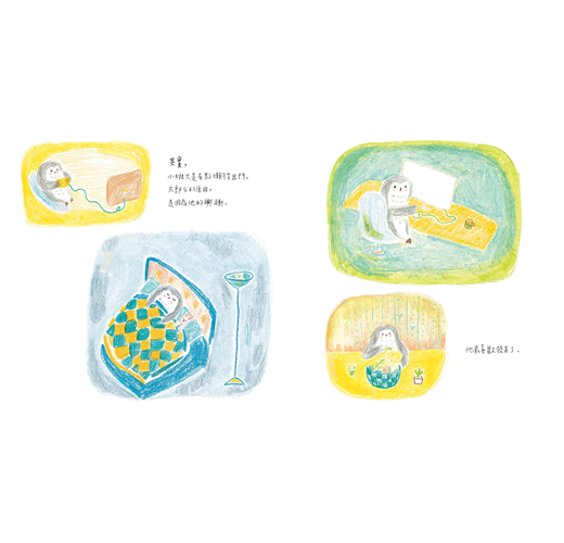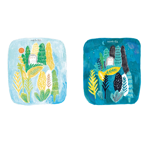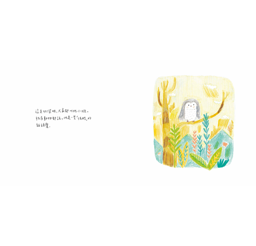 剛開始創作這個故事時沒有想得太多,只是單純想畫一隻愛待在家的小動物,故事中加入許多關於夜晚、貓頭鷹、森林等等喜歡的元素,故事大綱很快的就完成了。回頭一看才發現,啊!就是自己今年初的生活。經歷許多案子製作、課程準備,自己陪著自己待在有點孤僻的小天地中。不過,隨著生活與工作交替變化,小班的心情也漸漸改變,雖然還是喜歡發呆,但也發現生活更多面貌,我想,我也是一樣的。你呢?