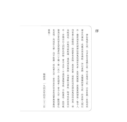 神仙鬼怪之說,大多倡自道教之徒,所以愚惑人民,以信其教。其說或本諸古代傳說,或襲自西來佛經,加以虛飾,及種種附會之談,於是除人間以外,儼若別有所謂神仙與鬼怪諸世界者,其荒誕無稽,原無置辨價值。惟今人仍有奉之惟敬的,抑若實有其物,真有其事;而對於這些神仙鬼怪的由來,卻未暇深究,以致明被欺瞞,還是深信無疑。本書雖云掌故,除考究其由來以外,亦隱示以人們對此四物,實不足信。不過因篇幅有限,不能盡述,故所載僅為日常所習見習聞者的二十種。舉一反三,是在讀者。當今之世,雖科學已見昌明,然迷信之舉,仍不能廢,則...