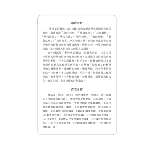 「事物掌故叢談」是中國民俗和文學史專家楊蔭深先生代表作。全套書按「歲時令節」、「神仙鬼怪」、「衣冠服飾」、「飲料食品」、「居住交通」、「器用雜物」、「遊戲娛樂」、「穀蔬瓜果」、「花草竹木」分為九個大類。探究日常生活中五百多種事物的最初來源和歷史演變,囊括古今中外眾多的典故常識,基本涵蓋人們日常生活的方方面面。