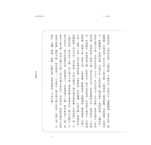昔二儀未分,溟涬鴻濛,未有成形,天地日月未具,狀如雞子,混沌玄黃,已有盤古真神,天地之精,自號元始天王,遊乎其中。溟涬經四劫,天形如巨蓋,上無所繫,下無所依。天地之外,遼屬無端,玄玄太空,無響無聲,元氣浩浩,如水之形。下無山嶽,上無列星,積氣堅剛,大柔服維,天地浮中,展轉無方,若無此氣,天地不生。天者如龍,旋回雲中,復經四劫,二儀始分,相去三萬六千里。元始天王在中心之上,名曰玉京山。山中宮殿,並金玉飾之。常仰吸天氣,俯飲地泉。復經二劫,忽生太元玉女,在石澗積血之中,出而能言,人形俱足,天姿絕妙,常遊厚地之間,仰吸天炁,號曰太元聖母。元始君下遊見之,乃與通氣結精,招還上宮。當此之時,二氣絪緼,覆載氣息,陰陽調和,無熱無寒。天得一以清,地得一以寧,並不復呼吸宣氣,合會相成,自然飽滿,大道之興,莫過於此。結積堅固,是以不朽。金玉珠者,天地之精也,服之與天地相畢。元始君經一劫,乃一施太元母,生天皇十三頭,治三萬六千歲,書為扶桑大帝東王公,號曰元陽父。又生九光元女,號曰太真西王母,是西漢夫人。天皇受號十三頭,後生地皇十一頭,地皇生人皇九頭,各治三萬六千歲。於今所傳三皇天文,是此所宣,故能有諸天上大聖及地下神靈,無所不制,故天真皇人,三天真王,駕九龍之輿之是也。次得八帝,大庭氏、庖犧、神農、祝融、五龍氏等,是其苗裔也,今治五嶽。
