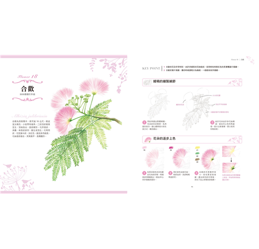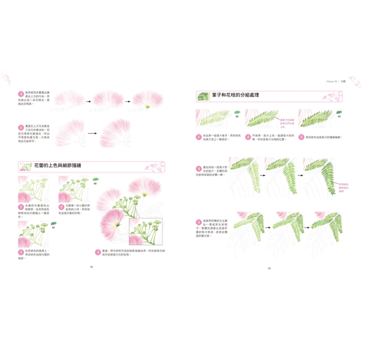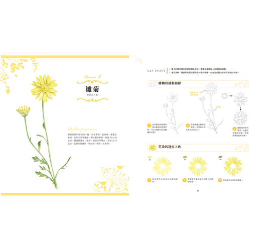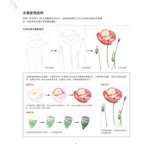 每一則花朵範例,從線稿的描繪到上色的過程都有相當細緻的步驟講解,透過循序漸進的示範教學方便讀者更容易理解並掌握色鉛筆的繪畫技巧。此外,書中還針對繪畫重點進行講解提示,對於初學者而言非常實用;有別於以往的色鉛筆教學書,本書作品範例較為進階,也很適合想提升繪畫能力的讀者。