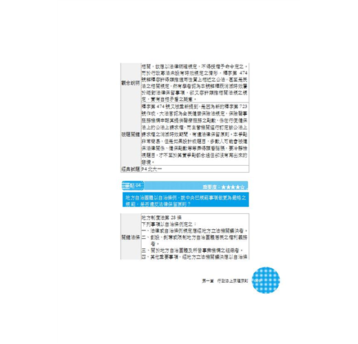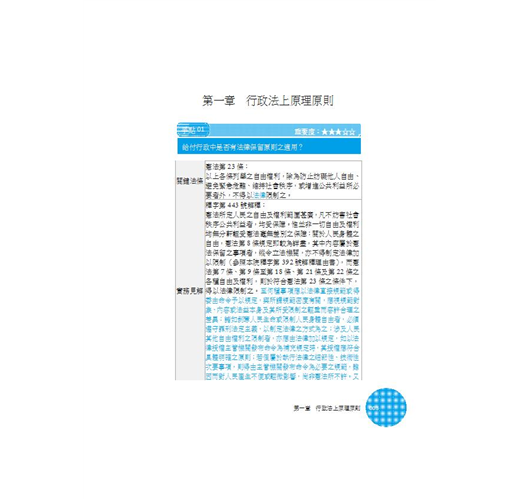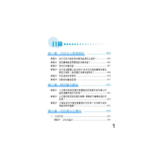 國家考試的行政法科目,範圍既廣且深,各位考生除需要熟稔行政法各概念之內涵,層出不窮的實務見解(包含行政法院判例、決議以及座談會)和學說對於欲獲得高分的考生亦不可或缺。所以本書就實務見解及學說的部分做出彙整及分析,供考生於考前反覆閱讀;本書最後將是考生們於考前的一本快速秘笈,而且頁數不多、攜帶方便,是上考場的必備利器呀!