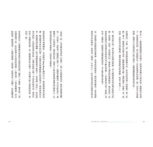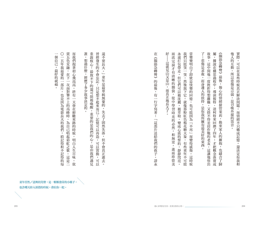 在此,我要把篇幅留給這一路上的貴人們。我要謝謝在藝術眼光、人生哲學上帶領我的秀瓊導演,在八年前金穗獎提攜我的聞老師,一直細細給我關照和指導的藍老師,還有最初最初給我刊稿機會的《人本教育札記》,持續給我厚愛給我寬大的發揮空間的《BIOS Monthly》總編為翔,用心幫助我在《SOS Reader》專欄嘗試新想法的宜蒨,當然還有三采的三劍客:慧眼給我機會的曉雯姐,真心對待我的文字的又瑜,以及悉心安排宣傳的小柔。