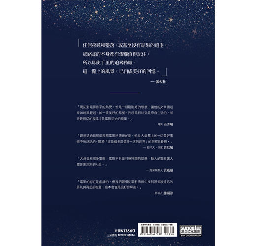 如果我們把電影當成一門娛樂產業看待,那麼硯拓大概是當一門宗教看待。他的字裡行間不會看到艱澀用語,而是真心誠意地構聯每一刻吉光片羽出現的感動物語。電影的存在是虛構的,但我們習慣從電影情節中找到那些被遺忘的勇氣與再起的能量,這本書會是很好的解答。