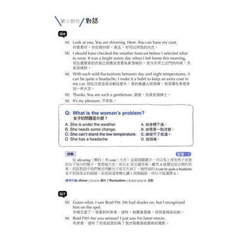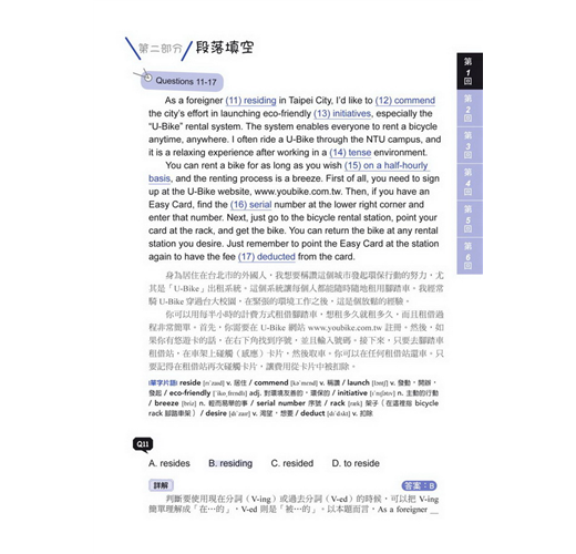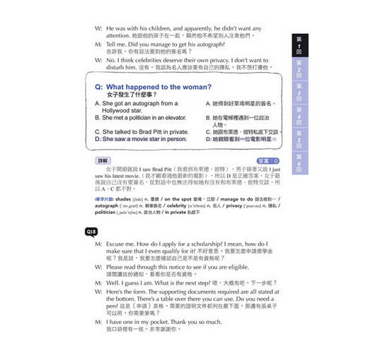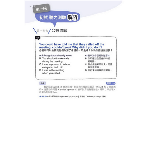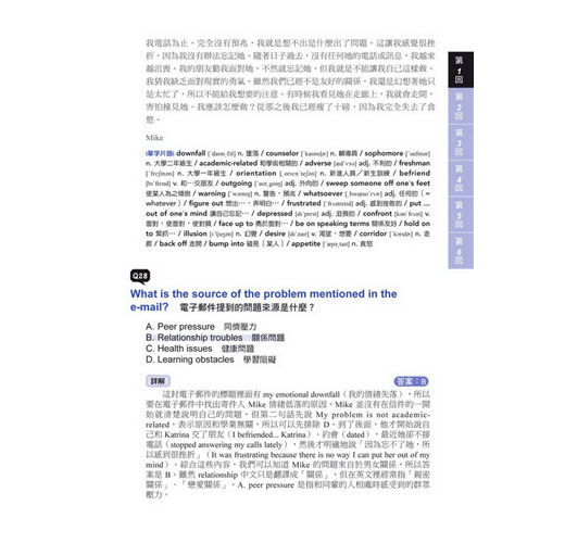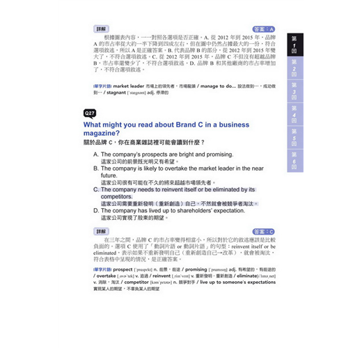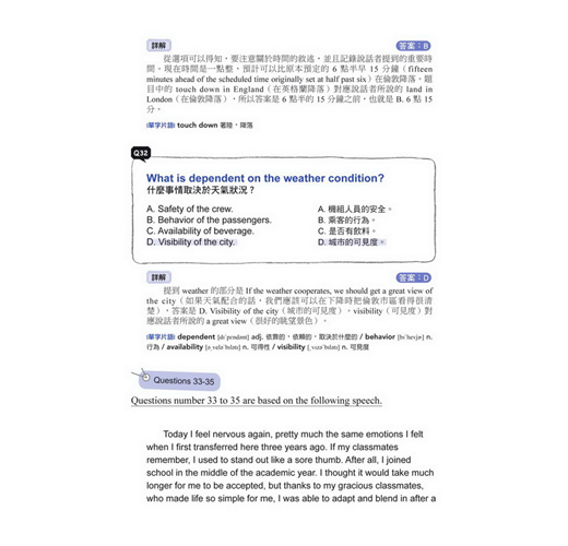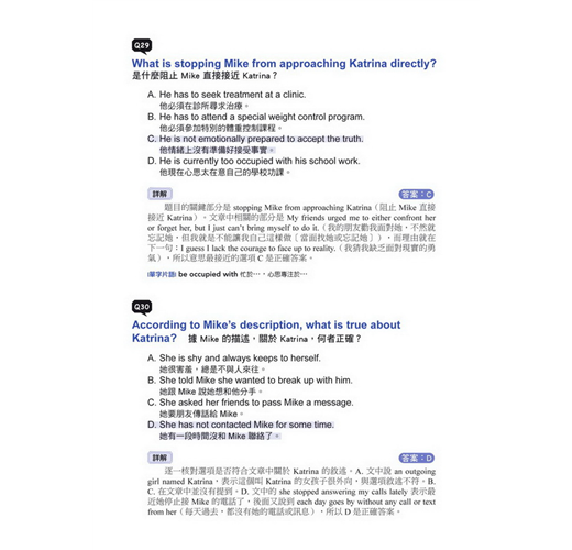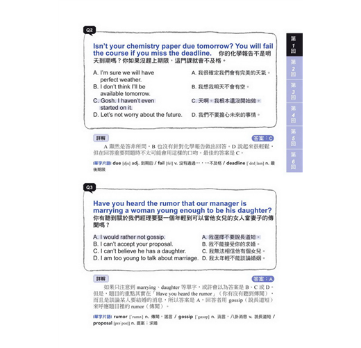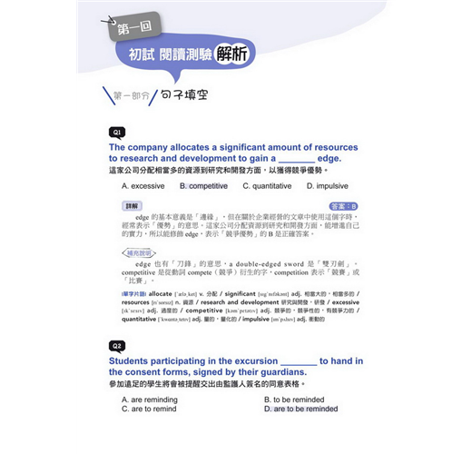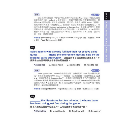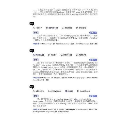 如果只是學一題、懂一題,學習效率就太差了!除了每一題的詳盡解題分析以外,郭老師也不厭其煩在解說中補充相關的考試重點,讓你能夠應對各種變化題型。另外,在許多選項與答案中,我們也提供了相關的例句,讓讀者不只是學單一的單字,連句子、用法都能一併學起來。