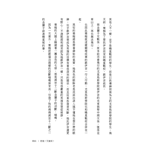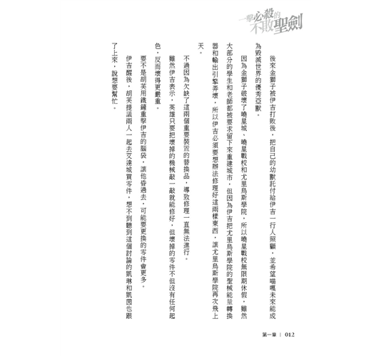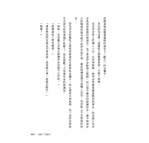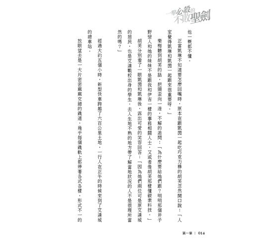 這時,凱茵牽著胡芙來到大家的眼前,說:「好了,我們去辦理入城手續後就進城吧。」接著她瞪向凱琳和倒在地上腦袋冒出腫包的伊吉,說:「請姊姊和伊吉同學不要惹麻煩,特別是伊吉,艾達城跟曉星城不一樣,是個有規矩的地方,只要隨便亂來,就會警衛盯上。」