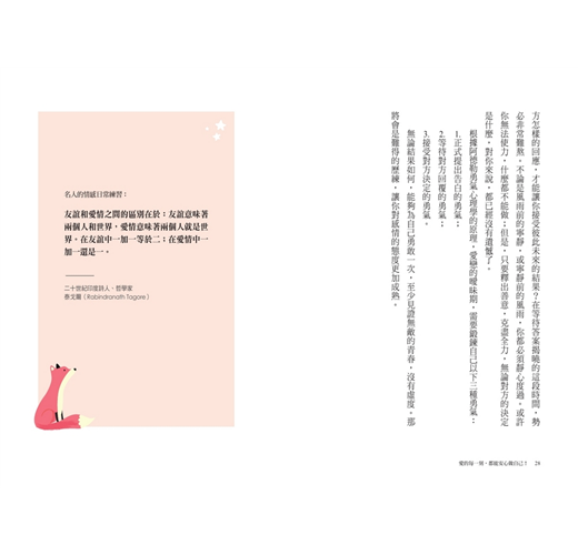 愛的練習,就是生命態度的詮釋與學習。12個愛的心路歷程,也是鍛鍊生命勇氣的過程。透過吳若權和阿德勒的溫柔提醒,我們或能減少摸索、停止碰撞,在繞了感情地圖一大圈後,回到那莫忘初衷的原點──好好愛自己,安心做自己。