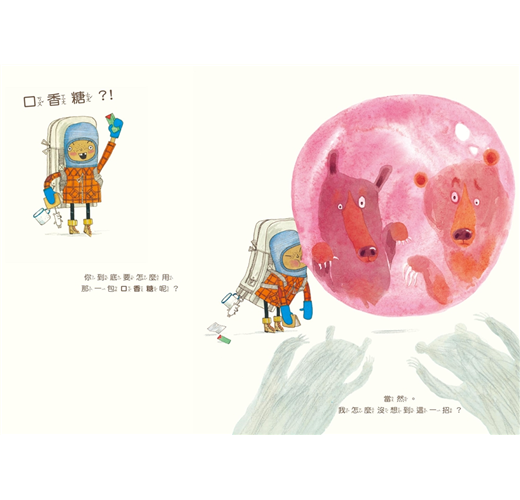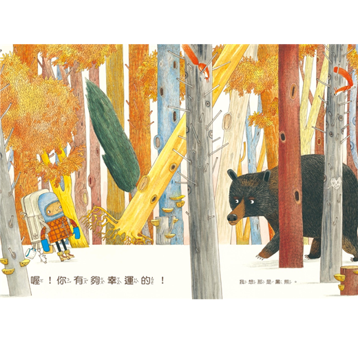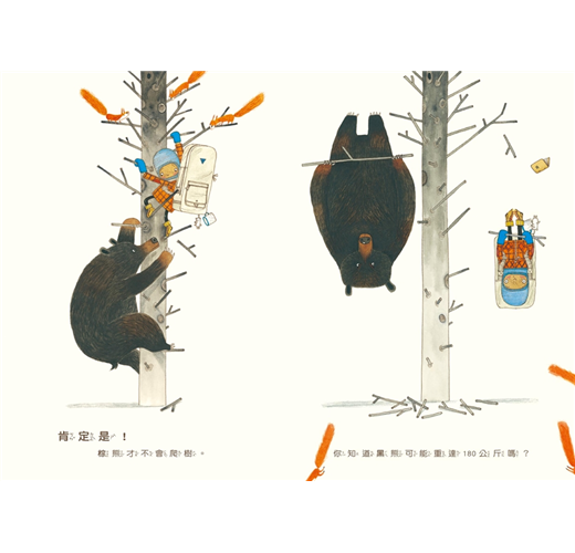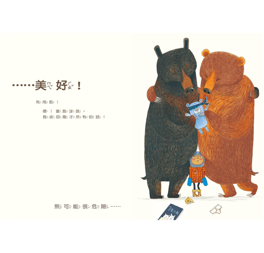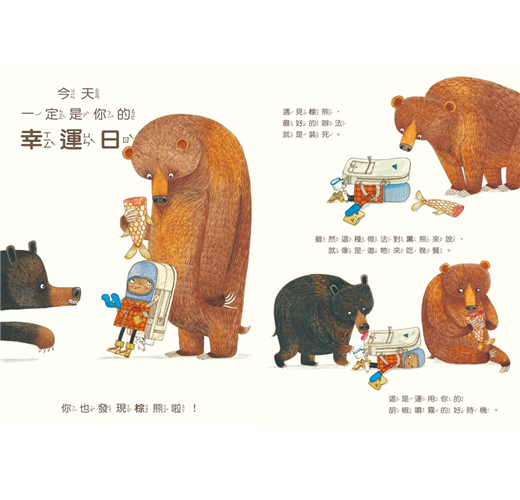 故事的旁白既像在跟小男孩說話,也像對著讀者說話。文字繞著黑熊與棕熊打轉,黑熊是黑色的,棕熊是棕色的,不過黑熊的毛色有時候有點棕,棕熊的毛皮有時候有點黑;其中有一種熊會爬樹喔,如果遇到牠,躲到樹上也沒用;另一種熊嘛,假如你躺在地上裝死,正好被牠當成免費的大餐!本書文字幽默,圖像帶著隨性不羈卻別具巧思的趣味。故事最後,散落一地的小男孩的東西是情節急轉直下的伏筆,讀者揣度作者在畫面中埋藏的線索時,也彷彿看見作者眼裡閃現淘氣的光芒,得意的誇讚故事帶來的無限驚奇。