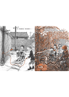 幾年前在做繪本讀書會規劃時,想訂定一個「世界童年鄉愁」的主題,內容極為類似《我的秘密研究基地》──那些「鄉下」的童年回憶。每每閱畢這類主題的繪本,想到自己的孩子(在城市長大的)可能都沒有機會這樣玩耍過(環境與玩伴),那時我就想,這也許是一種「世界性童年鄉愁」的消逝,除了作為我這一代或上一代經歷過這種童年的悼念之外,這類主題會不會變成一種「不可思議」,這類「鄰里日常」之「童心魔幻」。因此,很慶幸看到《我的祕密研究基地》這主題的「復活」,說「復活」不是客套,這本書很美,用黑白去畫這個主題也很有意思,用橘紅色套在想像之物上,也令人為之一顫,黑白除了有懷舊之意,也令人分不清時空,橘紅色在新舊(現實與想像)之間呼之欲出,實在是很漂亮、很切題。角色的遞增也很有趣,像一個舞台,每個一場景新增一名演員。
