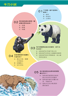 設有「動物小百科」單元,特別介紹熊科動物及靈長目動物的構造與小常識,以及棕熊、貓熊、北極熊、大猩猩、日本獼猴、東非狒狒等動物的超炫常識,讓小朋友有系統的學習。