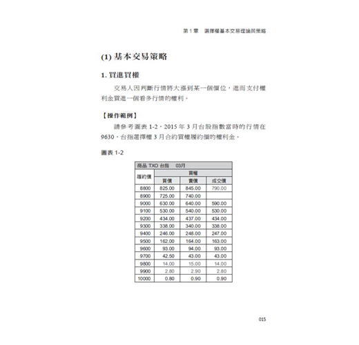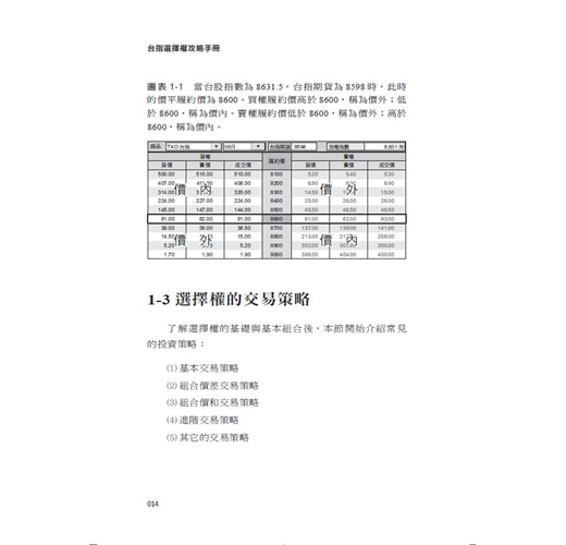 最後,再針對市場上幾種最常用的交易策略,教大家透過適當的判斷工具來研判行情,讓只喜歡交易單一買方的交易人不再時常吃歸零糕;讓喜歡作莊家的賣方可以同時兼顧風險與利潤。保守的交易人則可以透過垂直價差等複式交易策略從交易中逐漸累積財富。