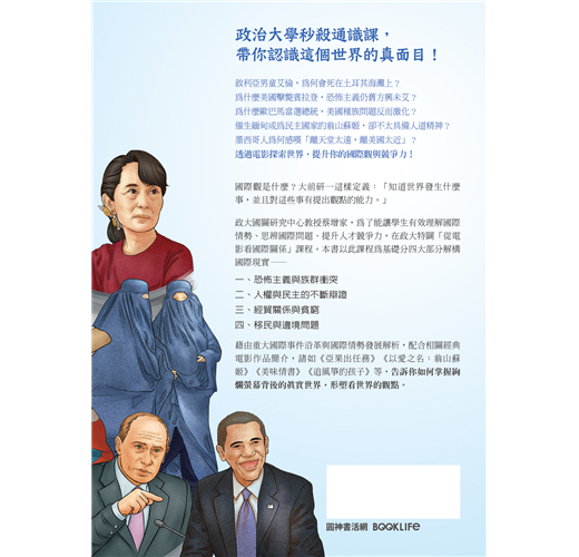 藉由重大國際事件沿革與國際情勢發展解析,配合相關經典電影作品簡介,諸如《亞果出任務》《以愛之名:翁山蘇姬》《美味情書》《追風箏的孩子》等,告訴你如何掌握絢爛螢幕背後的真實世界,形塑看世界的觀點。