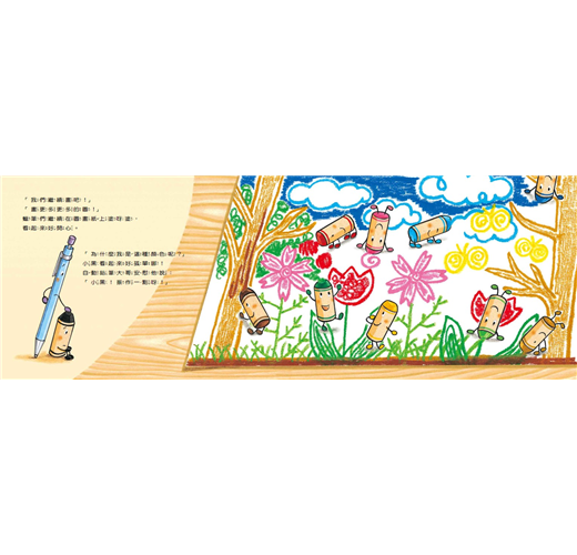蠟筆們發現了一張好大的圖畫紙,真是太棒了!於是他們一樣接著一樣畫個不停,蝴蝶、花朵、樹木……。只有小黑被晾在一邊,不能一起畫。因為他會把圖畫弄的黑黑的……