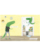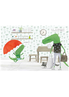 小鱷魚阿菲其實很早就醒了,可是當媽媽來叫他起床的時候,他卻用棉被矇著頭,對媽媽說:「阿菲不在這裡」。澳洲繪本作家安娜・沃克的作品,就跟其他的好繪本一樣,除了用文字說故事之外,也充滿了豐富的圖像敘事。早從書名頁的圖像上,故事就已經開始了,窗外太陽升起的高度就是線索:注意到書名頁上太陽的高度,和媽媽進到房間時窗外太陽的高度,有什麼不同嗎?在這本書中,總共有四個開頁出現太陽,除了呼應媽媽對阿菲說的「外面的陽光好燦爛」之外,太陽位置的變化也暗示了時間的推進。雖然媽媽一直說「阿菲,快一點!」,但是圖像上告訴我們,阿菲在吃早餐時,時鐘指著八點二十分,到最後媽媽說:「阿菲,我們真的要走囉」,這時,時鐘的指針已經過了十一點半了!
