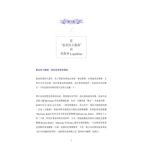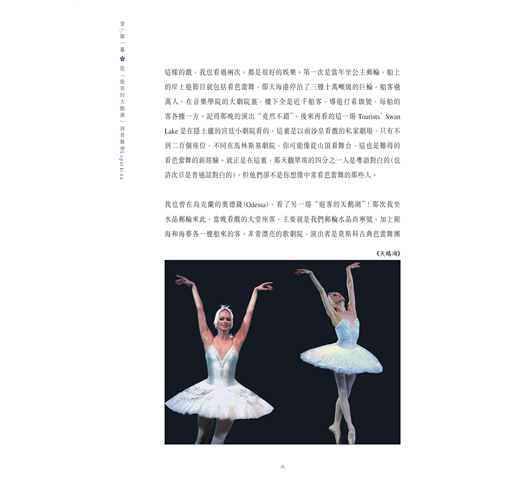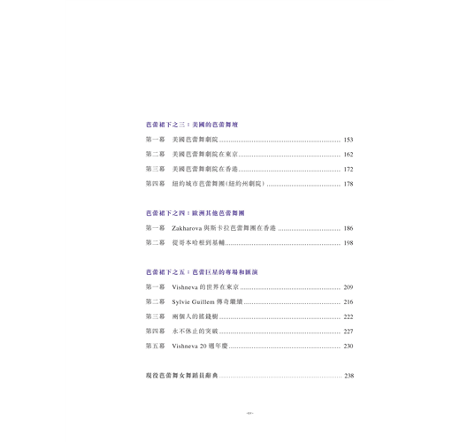 作者周遊列國欣賞眾多芭蕾舞劇目,訪問當今知名的舞蹈員、撰寫賞評,旨在向讀者介紹絢爛多彩的芭蕾舞壇世界。