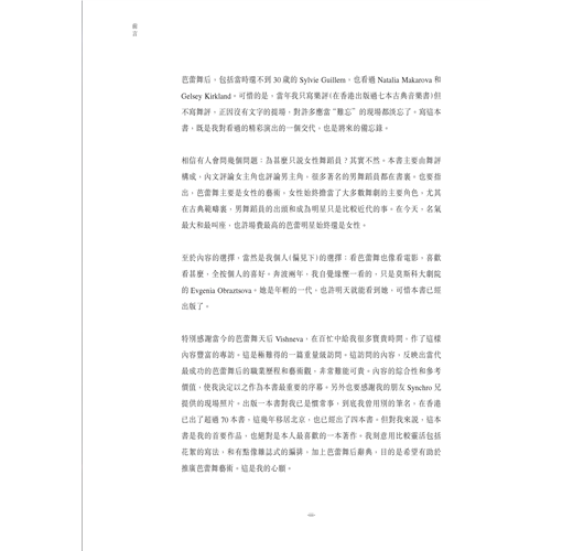 特別感謝當今的芭蕾舞天后Vishneva,在百忙中給我很多寶貴時間,作了這樣內容豐富的專訪。這是極難得的一篇重量級訪問。這訪問的內容,反映出當代最成功的芭蕾舞后的職業歷程和藝術觀,非常難能可貴。內容的綜合性和參考價值,使我決定以之作為本書最重要的序幕。另外也要感謝我的朋友Synchro兄提供的現場照片。出版一本書對我已是慣常事,到底我曾用別的筆名,在香港已出了超過70本書,這幾年移居北京,也已經出了四本書。但對我來說,這本書是我的首要作品,也絕對是本人最喜歡的一本著作。我刻意用比較靈活包括花絮的寫法,和有點像雜誌式的編排,加上芭蕾舞后辭典,目的是希望有助於推廣芭蕾舞藝術。這是我的心願。