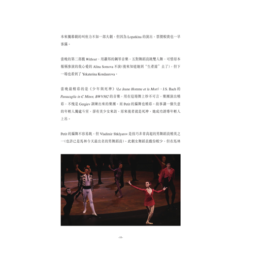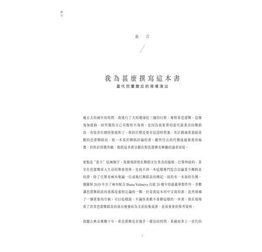 要點是“當今”這兩個字。我發現即使在舞蹈文化普及的倫敦、巴黎和紐約,甚至在芭蕾舞深入生活的聖彼得堡,也找不到一本這樣專門綜合討論當今舞蹈員的書。除了巴黎有兩本專論一位或幾位舞蹈員的傳記,紐約有一本新的自傳,俄羅斯2015年出了兩本配合Diana Vishneva出道20週年的超豪華製作外,多數講芭蕾舞蹈員的書都是蓋棺定論的一類,於是我這本用中文寫的書,竟然填補了一個重要的空缺。可以這樣說,不論你喜歡不喜歡這樣的一本書,我在現場看了許多芭蕾舞蹈員的演出後發而為文並結集成書,是很重要的參考資料。