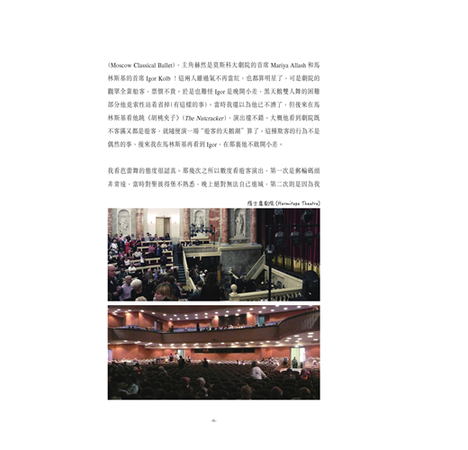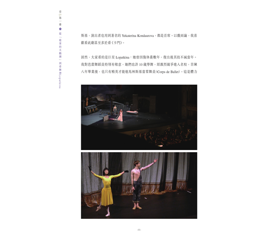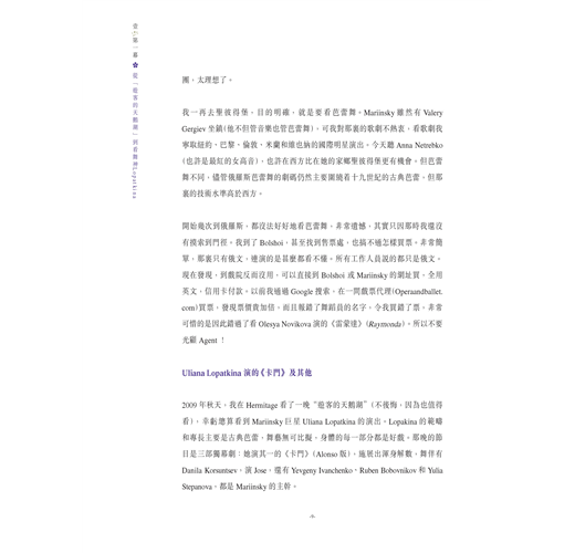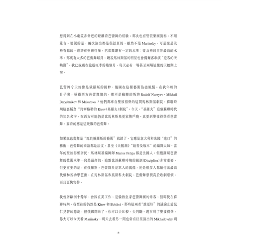 至於內容的選擇,當然是我個人(偏見下)的選擇:看芭蕾舞也像看電影,喜歡看甚麼,全按個人的喜好。奔波兩年,我自覺緣慳一看的,只是莫斯科大劇院的Evgenia Obraztsova。她是年輕的一代,也許明天就能看到她,可惜本書已經出版了。