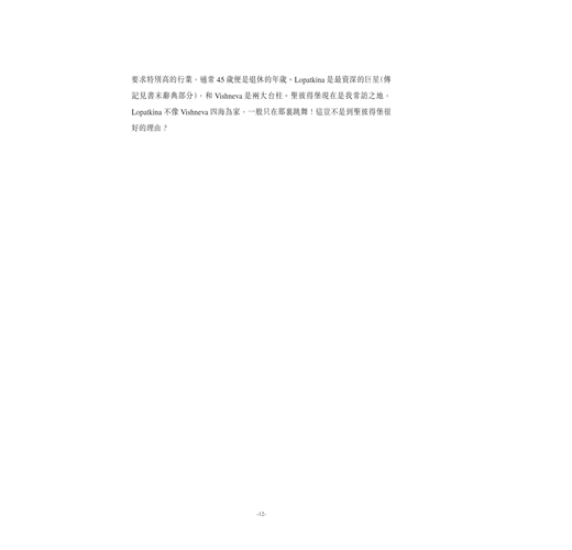 我有幸先後有四次機會和Vishneva在後台見面,需承認我是她的粉絲。最有緣的是,最近去莫斯科看她的20週年演出,竟然在酒店的大堂碰到她。但顯然,那些場合做不了訪問,即使能面談也會有語言的隔閡。而且我希望有的是一篇深入的訪問。多謝她的“金牌經理人”和得力助手,讓我取得了這篇三千多字的實質訪問。我用英文提問,翻譯成俄文後,她親自答了,再譯成非常講究的英文。謝謝當今最高酬的芭蕾舞后的寶貴時間。在訪問中她解釋了為甚麼近年不常演古典芭蕾舞:這是我的很多俄羅斯朋友也想知道的答案。訪問中她對所謂技巧,甚至“炫技”的問題,作了非常好的見解,我讀了也得益不淺。這解釋的權威性,在於她早已證明了自己也是技巧大師。這篇訪問具有非常重要的引導性,所以我用它作為本書最重要的序曲。