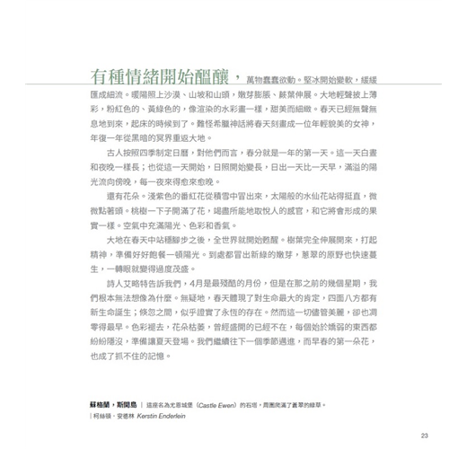 詩人艾略特告訴我們,4月是最殘酷的月份,但是在那之前的幾個星期,我們根本無法想像為什麼。無疑地,春天體現了對生命最大的肯定,四面八方都有新生命誕生;倏忽之間,似乎證實了永恆的存在。然而這一切儘管美麗,卻也凋零得最早。色彩褪去,花朵枯萎,曾經盛開的已經不在,每個始於嬌弱的東西都紛紛隱沒,準備讓夏天登場。我們繼續往下一個季節邁進,而早春的第一朵花,也成了抓不住的記憶。