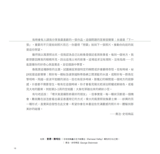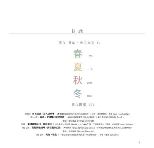 前言作者──《國家地理》雜誌定期撰稿人暨空拍攝影大師喬治‧史坦梅茲,以自身職涯經歷娓娓道來,引領讀者張開攝影眼,探索全球四季美景。本書也收錄學者、詩人、攝影師之言,營造照片意境、講述拍攝過程,有助讀者更加深刻領略作品精隨。