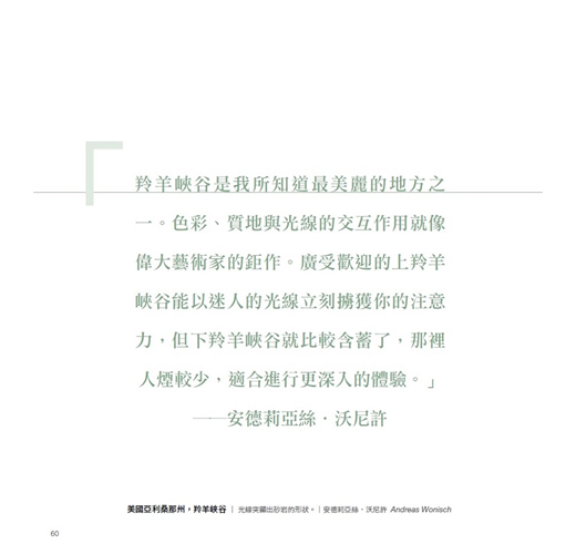 在國家地理學會叢書部整理出的這本精采攝影集中,我們跨越了時空的限制,無所不至,深受美麗照片薰陶之餘,也拓展了新的視角禮讚這片萬千大地。