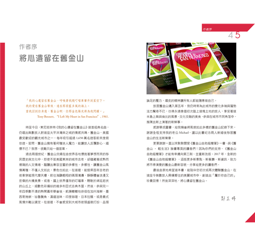最後由衷地希望這本書,能陪伴您初次或再次體驗舊金山,在這座令無數旅人興嘆嚮往的美麗城市中,創造出「屬於你自己的」珍貴回憶!然後深深地,將心遺留在舊金山。